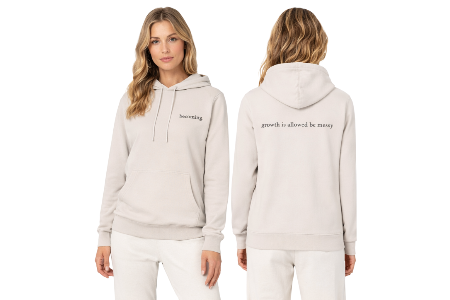 March is about growth in motion. The Becoming collection honors the messy, transitional season between who you were and who you’re becoming. Designed for spring layering and everyday athleisure, this minimalist women’s hoodie represents personal growth, identity shifts, and intentional self-development.